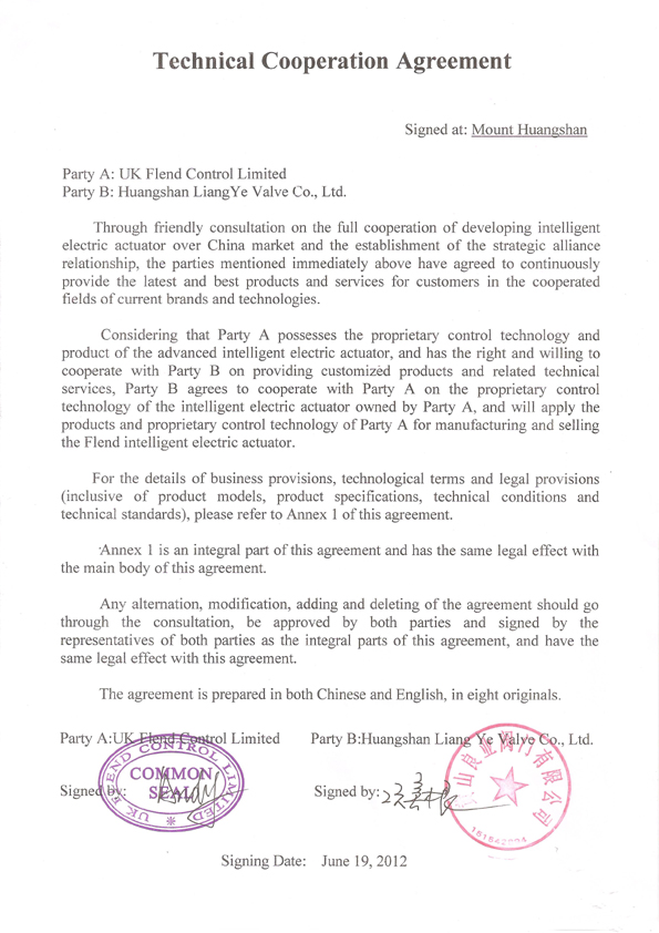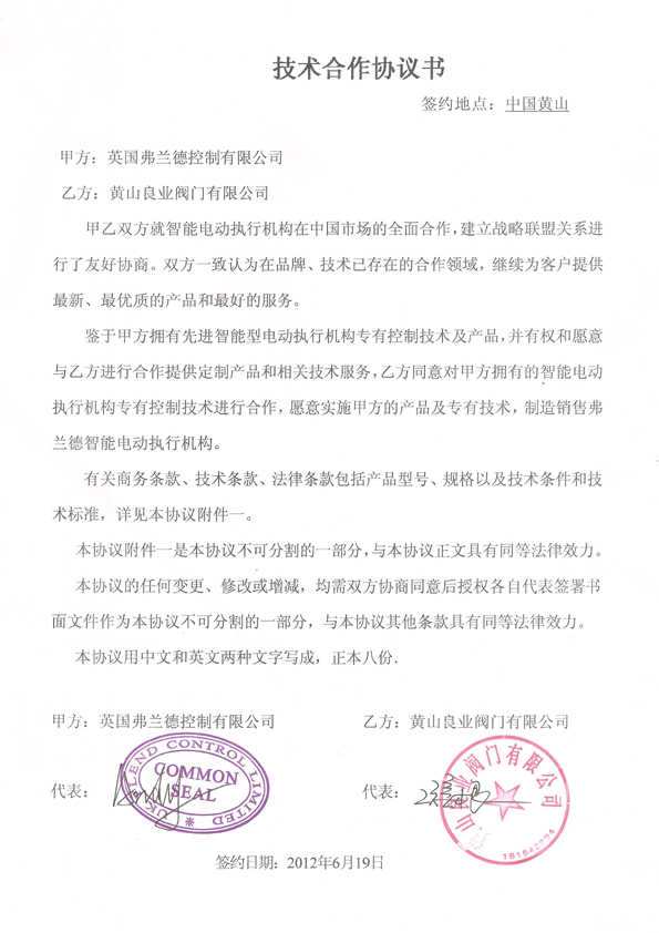 文章詳情鑒于英國(guó)弗蘭德控制公司(UK Flend Control Limited)擁有世界先進(jìn)水準(zhǔn)的智能型電動(dòng)執(zhí)行機(jī)構(gòu)專(zhuān)有控制技術(shù)及產(chǎn)品,黃山良業(yè)閥門(mén)有限公司又有良業(yè)的電動(dòng)執(zhí)行機(jī)構(gòu)研究、開(kāi)發(fā)與制造歷史與記錄。經(jīng)雙方洽談,黃山良業(yè)閥門(mén)有限公司和英國(guó)弗蘭德控制公司最近正式簽訂了智能型電動(dòng)執(zhí)行機(jī)構(gòu)在中國(guó)市場(chǎng)的全面合作協(xié)議。雙方一致認(rèn)為在品牌、技術(shù)方面,已存在良業(yè)的的合作領(lǐng)域。決心繼續(xù)為客戶提供最新、最優(yōu)質(zhì)的產(chǎn)品和最好的服務(wù)。英國(guó)弗蘭德控制公司同意對(duì)黃山良業(yè)閥門(mén)有限公司的智能型電動(dòng)執(zhí)行機(jī)構(gòu)專(zhuān)有控制技術(shù)進(jìn)行合作,黃山良業(yè)閥門(mén)有限公司愿意實(shí)施英國(guó)弗蘭德控制公司的產(chǎn)品及專(zhuān)有技術(shù),制造銷(xiāo)售弗蘭德智能型電動(dòng)執(zhí)行機(jī)構(gòu)。此次技術(shù)合作,為黃山良業(yè)閥門(mén)有限公司今后的發(fā)展進(jìn)一步奠定了基礎(chǔ)。
